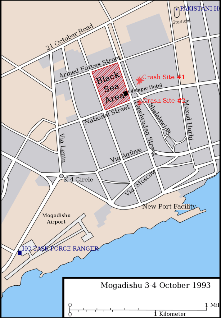 No domingo, dia 3 de outubro de 1993, a Força-Tarefa Ranger na Somália composta por membros das forças especiais dos Estados Unidos, receberam ordens para capturar o Ministro das Relações Exteriores de Aidid, Omar Salad Elmi, e seu principal conselheiro político, Mohamed Hassan Awale.