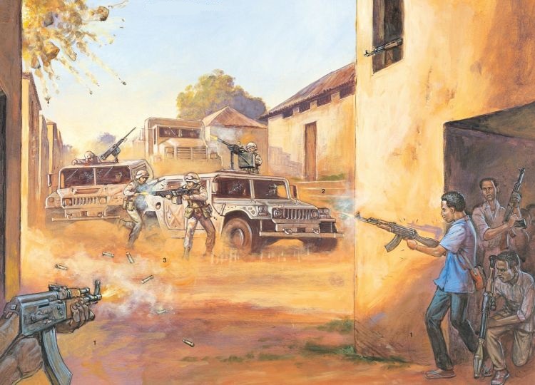 16h35 – O comboio fez uma curva errada e se perdeu entre as ruas da cidade, sofrendo pesadas baixas de atiradores somalis e milícias armadas.