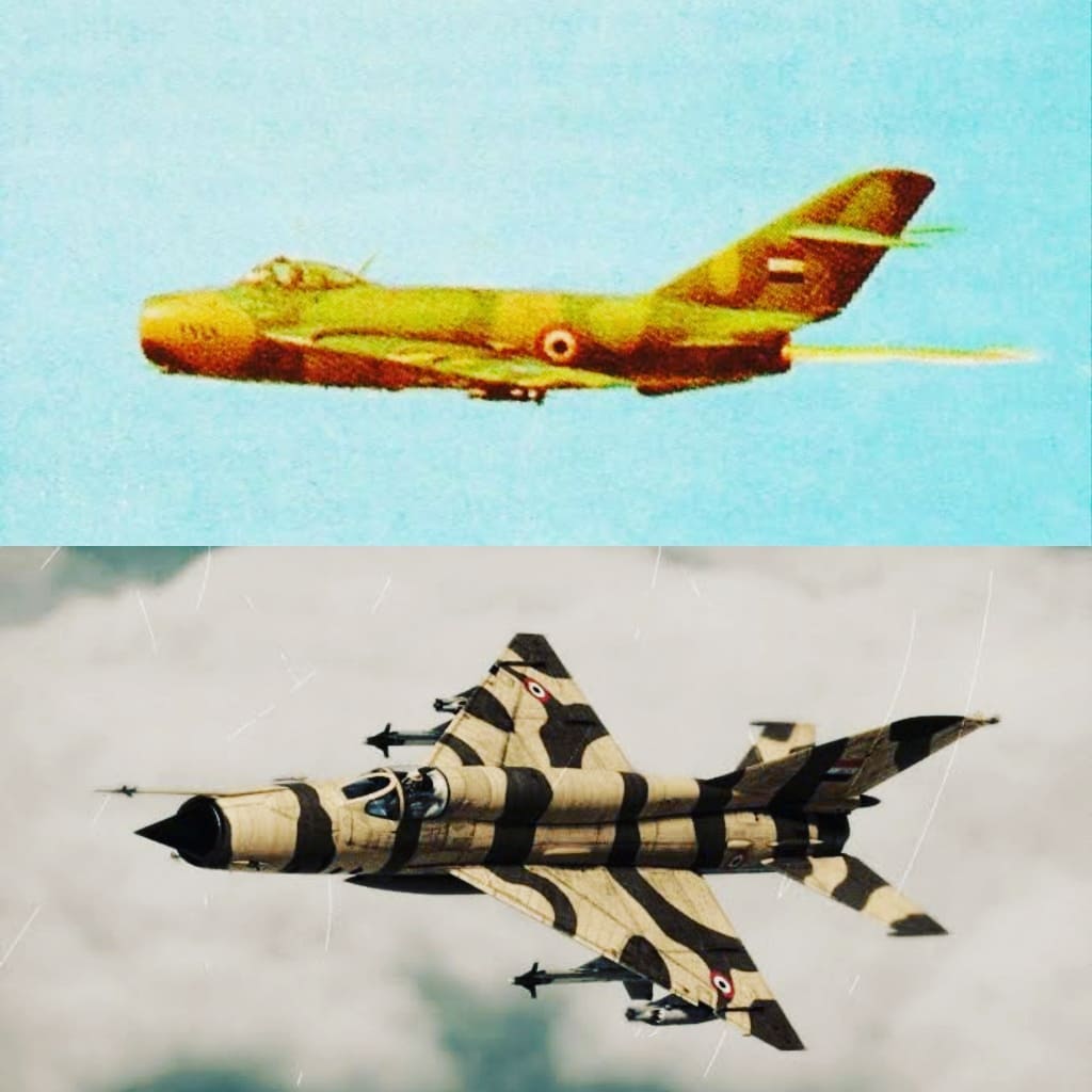 Um Mikoyan-Guerevich MiG-17 “Fresco” (acima) e um Mikoyan-Guerevich MiG-21 “Fishbed” da Força Aérea Egípcia.
