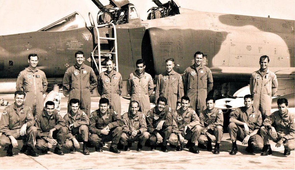 IMAGEM DE CAPA: Aviadores israelenses do Esquadrão 69 aprendendo a pilotar o caça McDonnell Douglas F-4E Phantom II (ajoelhados) e seus instrutores norte-americanos (em pé) na George AFB, 1969, Muitos desses pilotos e WSO (Operadores de Sistemas de Armas) participaram da Operação Priha.