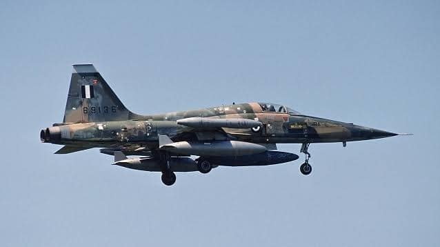 Um Northrop F-5A que pertenceu a Força Aérea da Grécia em voo, em meados da década de 1980.