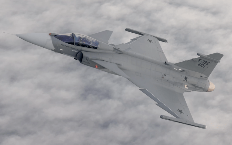 O Saab F-39E Gripen FAB 4101. As primeiras aeronaves entrarão em operação na FAB ainda em 2022.