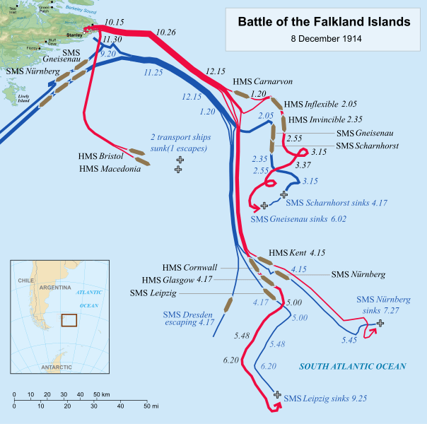 O almirante Graf Maximilian von Spee comandando o esquadrão alemão de dois cruzadores blindados, SMS Scharnhorst e Gneisenau, os cruzadores leves SMS Nürnberg, SMS Dresden e SMS Leipzig, os carvoeiros SS Baden, SS Santa Isabel e o navio-hospital SS Seydlitz tentaram invadir a base de suprimentos britânica em Stanley nas Ilhas Malvinas. O esquadrão britânico composto pelos cruzadores de batalha HMS Invincible e Inflexible, os cruzadores blindados HMS Carnarvon, Cornwall e Kent, o cruzador mercante armado HMS Macedonia e os cruzadores leves HMS Bristol e Glasgow (sobrevivente da Batalha de Coronel) chegaram ao porto no dia anterior.