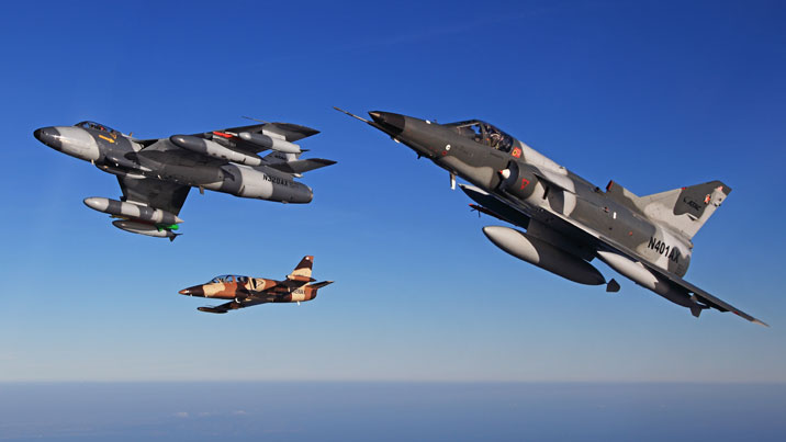 IMAGEM DE CAPA: Aeronaves da ATAC em voo posam para uma fotografia em formação: Hawker Hunter, Aero L-39 e IAI Kfir.