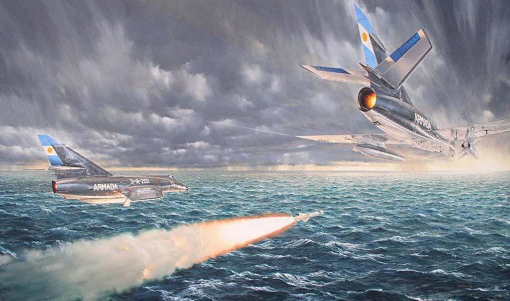 Arte retratando o encontro das aeronaves que supostamente atacaram o HMS Invincible, no dia 30 de maio de 1982. Em primeiro plano o Dassault Super Étendard 3-A-202, que segundo fontes argentinas foi o responsável por lançar o míssil em direção ao porta-aviões inglês, danificando-o. (Foto: GBN Defense)