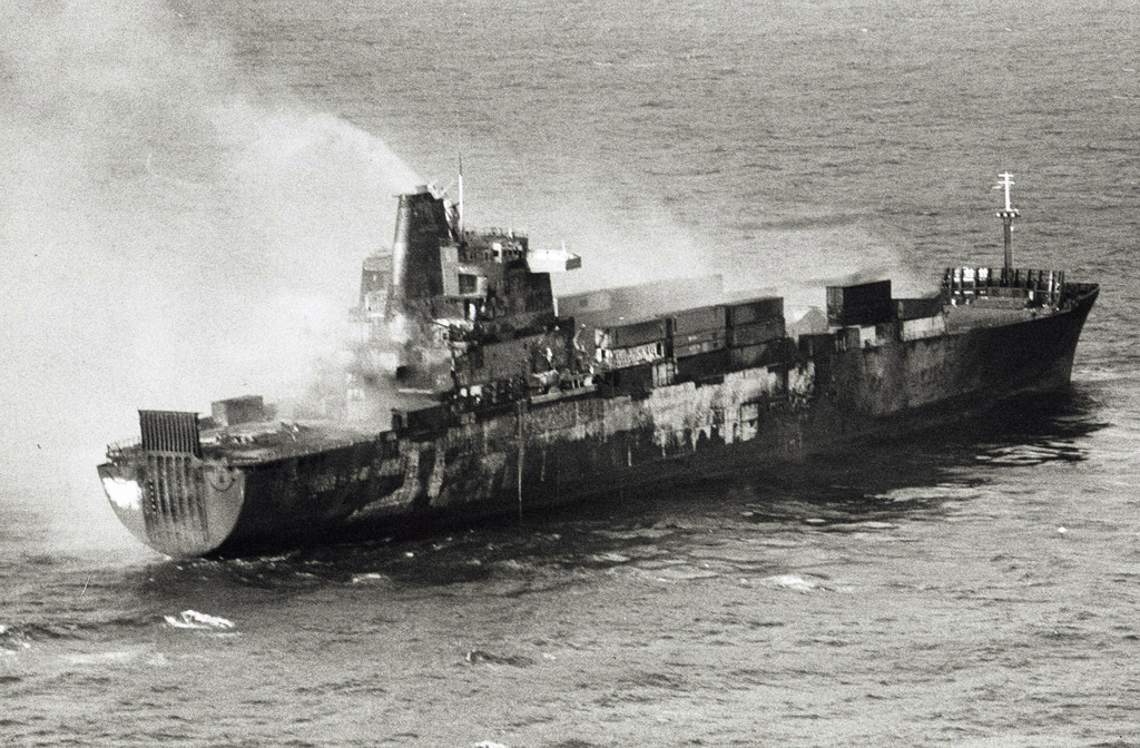 O MV Atlantic Conveyor pegando fogo após ser atingido por um Exocet, logo afundaria, levando para o fundo do mar valiosos suprimentos para os ingleses. (Fonte: “Sistemas de Armas”)