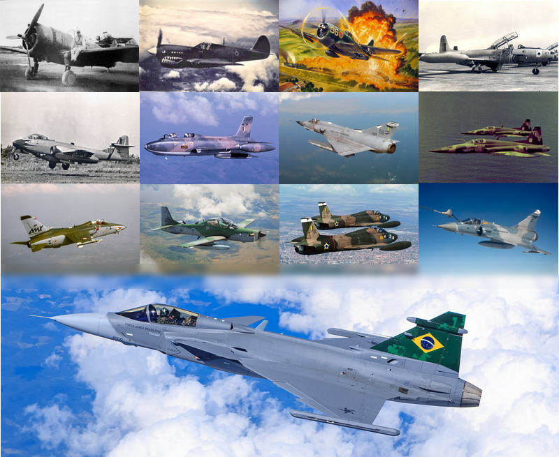 FOTO DE CAPA: Montagem mostrando diferentes tipos de aeronaves de caça operadas pela Força Aérea Brasileira ao longo de sua história. (FONTE: Aviação em Floripa)