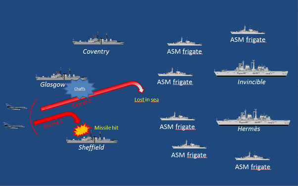 Em resposta ao aviso do Glasgow, uma ordem de prontidão foi emitida para as tripulações do canhão de 4,5 polegadas, Sea Dart e canhões de 20 mm. As aeronaves foram detectadas no radar avançado Tipo 909, mas não no conjunto de popa. O sensor UAA1 de Sheffield foi então bloqueado por uma transmissão não autorizada pelos sistemas de comunicação por satélite da nave (SCOT). Nenhuma informação foi recebida via link de dados de Glasgow. Sete segundos depois, o primeiro míssil Exocet foi disparado, em resposta ao qual Glasgow começou a lançar chaffs para tentar despistar o míssil. A bordo do Sheffield, só quando a fumaça do míssil foi avistada pelos vigias é que a tripulação percebeu que estava sob ataque. Os oficiais da ponte não chamaram o capitão para a ponte, não fizeram chamadas para estações de ação, não tomaram medidas evasivas e não fizeram nenhum esforço para preparar o canhão de 4,5 polegadas, os mísseis SAM Sea Dart ou ao menos ordenar o disparo de chaffs. O oficial de guerra antiaéreo foi chamado à sala de operações pelo principal oficial de guerra, chegando pouco antes de o primeiro míssil atingir.