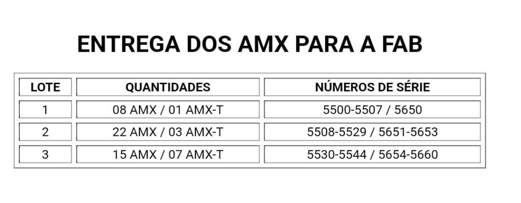 Vamos analisar a provável (muito possivelmente real) situação de cada uma dos AMX operados pela FAB. Das 56 aeronaves encomendadas (45 AMX A-1A e 11 AMX-T A-1B) uma não operou, pois caiu antes da entrega pela Embraer (o A-1A FAB 5532), totalizando 55 aeronaves operadas pela força. Atualmente a aeronave opera em dois esquadrões, o 1º/10º GAv (Esquadrão Poker) e o 3º/10º GAv (Esquadrão Centauro) em sistema de “pool” (as aeronaves são operadas pelos dois esquadrões):